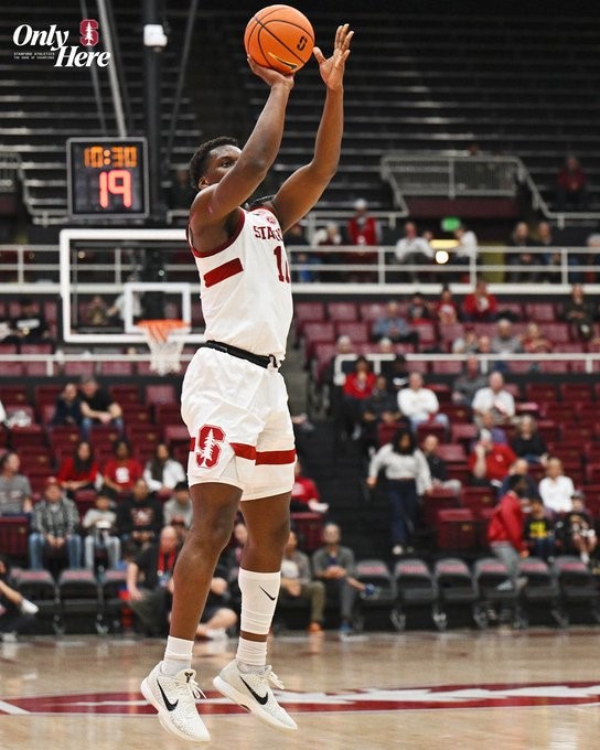 Stanford Cardinal forward Chisom Okpara (10) takes a jump shot against the Boston College Eagles at Maples Pavilion in Palo Alto on Wed Feb 26, 2025 (Stanford X photo)