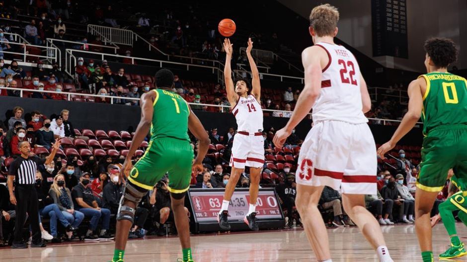 The Stanford Cardinal’s forward Spencer Jones (14) takes a jump shot against the Oregon Ducks in file photo. Jones and the Cardinal defeated the Liberty Flames at the Diamond Head Classic in the Stan Sheriff Center in Honolulu on Thu Dec 23, 2021 (Stanford Cardinal Athletics file photo)