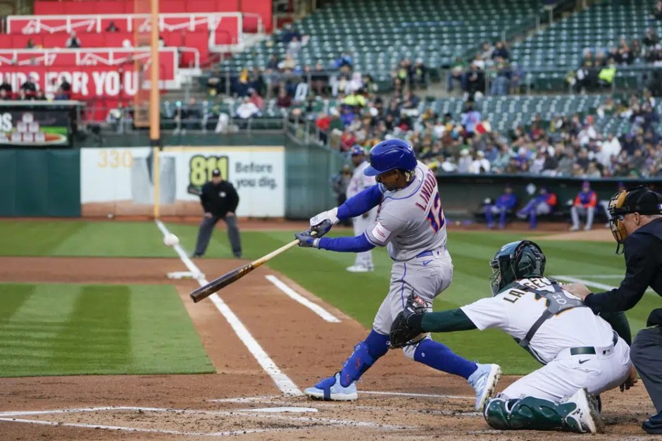 New York Mets’ Francisco Lindor , front left, hits a grand slam against the Oakland Athletics during the second inning at the Oakland Coliseum on Fri Apr 14, 2023 (AP News photo)