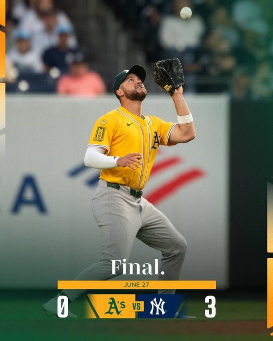 The score says it all as the Sacramento A’s were blanked for the second consecutive game in a row this time to the New York Yankees at Yankee Stadium in the Bronx 3-0 on Fri Jun 27, 2025 (A’s X photo)