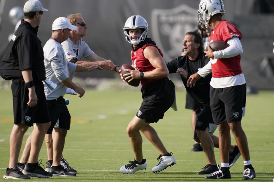 Las Vegas Raiders quarterback Derek Carr (8) gets some support during practice drills back on Tue Jun 15, 2021. Carr is all set to start against the Baltimore Ravens on Monday Night Football for the Sep 13th opener (AP file photo)