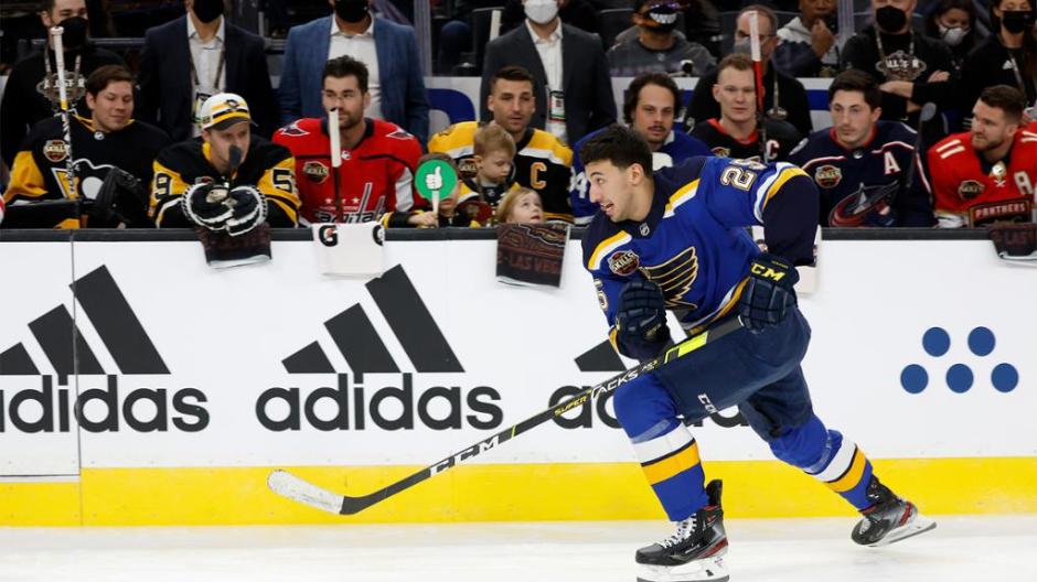 The St Louis Blues Jordan Kyrou shows his wares as the NHL’s fastest skater with a 13.550 beating out former fastest skater the Edmonton Oilers Connor McDavid at the NHL All Star skills contest at T Mobile Arena in Las Vegas (photo from nhl.com)