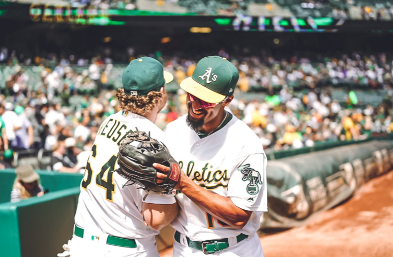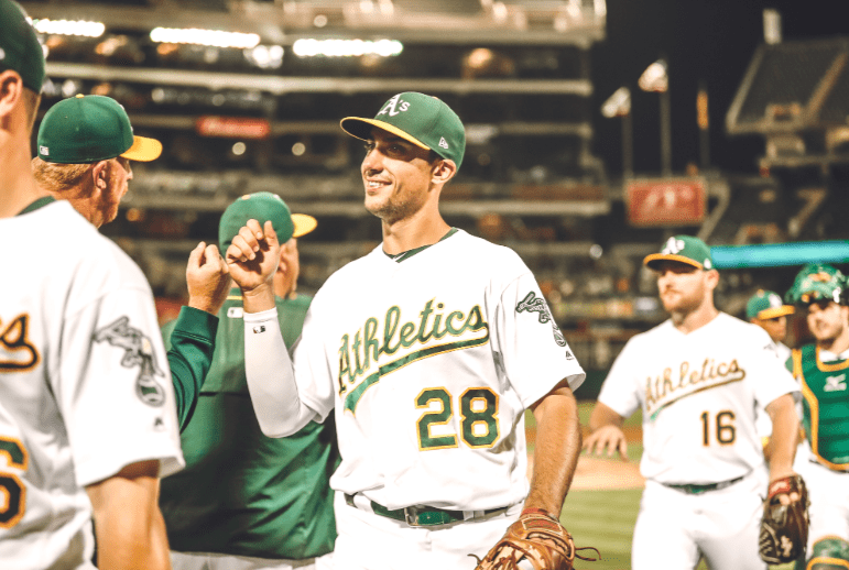 Danny Duffy, the Royals’ starting pitcher is a reminder that Kansas City’s most recent glory days are not that far back in the team’s past; he pitched a half a dozen innings in the 2014 and 2015 World Series for them. So far this year, his record had been a mediocre 6-6, 4.55 ERA, and he had yet to throw a pitch against the A’s. The Oakland hitter with the best record against him was Robbie Grossman at six for 17 (.353). The A’s switch-hitter outfielder was not in the A’s opening lineup, probably owing to his .180 batting average against lefties this year.