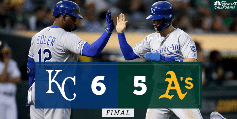 Wendelkin survived a hairy top of the 10th. Bubba Starling began it with a single to right. Meibris Viloria sacrificed him to second. Brian Phillips was out on a hard line drive to Canha in center. Mondesí walked to load the bases with two out. Then Wendelkin got Jorge Soler to swing and miss on a 1-2 slider.