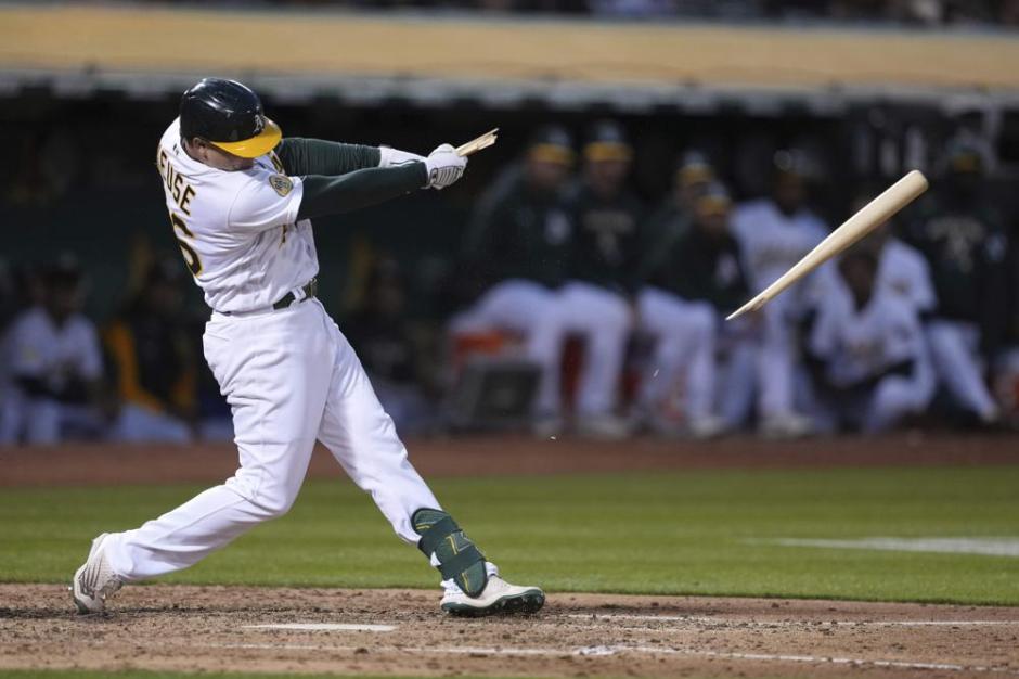 Oakland A’s hitter Sheldon Neuse takes a broken bat cut against the Texas Rangers in the sixth inning at the Oakland Coliseum on Thu May 26, 2022 (AP News photo)