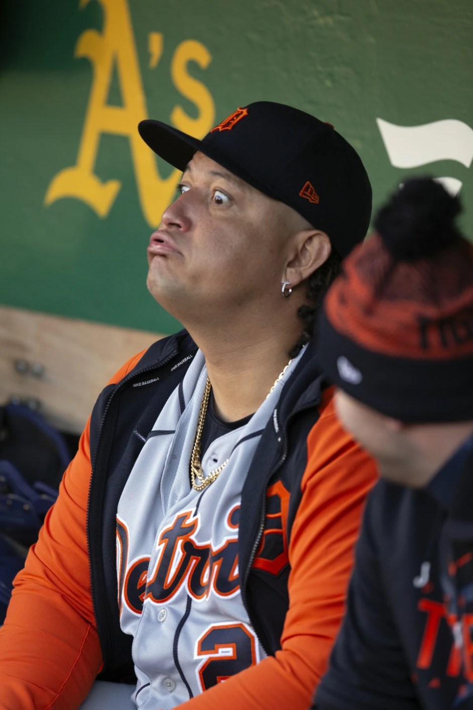 Detroit Tigers designated hitter Miguel Cabrera (24) makes a face that could only scare the Oakland A’s and it must’ve worked as the A’s got crushed by the Tigers 7-3 on Thu Sep 21, 2023 at the Oakland Coliseum (AP News photo)