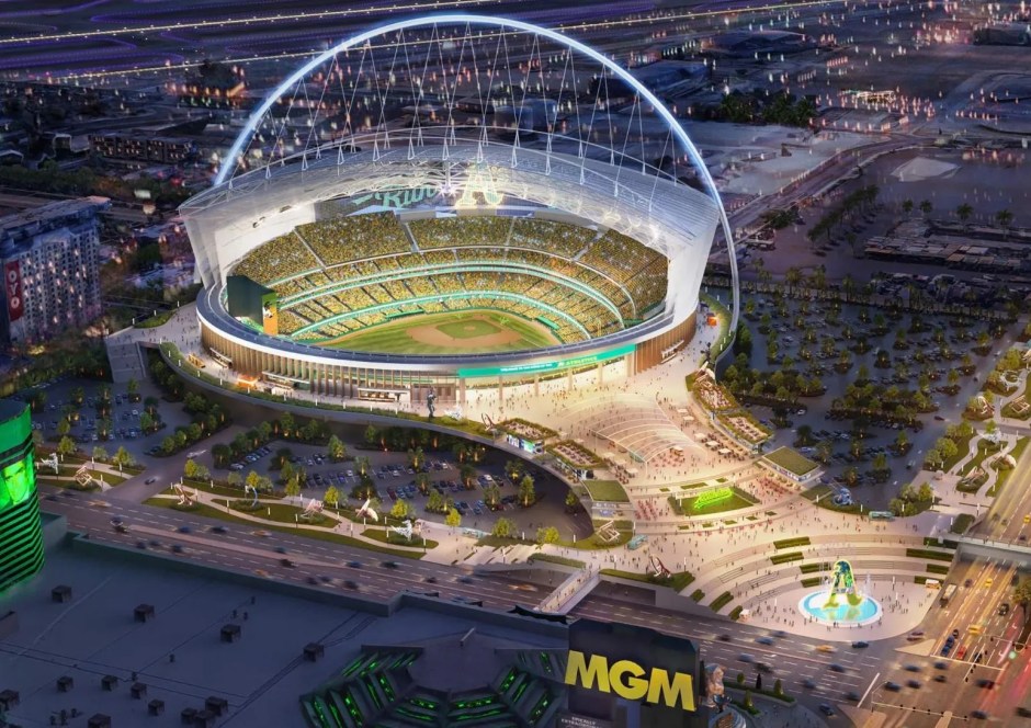 Don’t expect this rendering of the Oakland A’s ballpark as this was a stop gap rendering last summer after the A’s announced they were moving to Las Vegas in Jun 2023. As of yet the A’s have not submitted a rendering or blue prints for their new Las Vegas ballpark and the MLB owners are voting this week to move the A’s to Vegas without a rendering. (Oakland A’s rendering of Tropicana ballpark location)