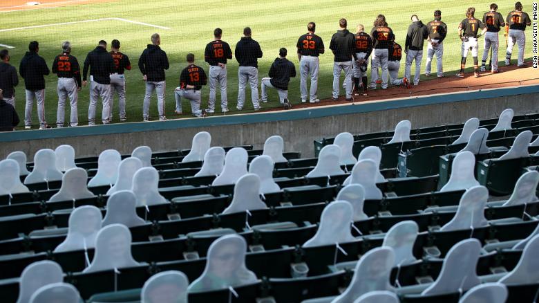 San Francisco Giants players take a knee during the national anthem before their exhibition contest against the Oakland A’s on Monday night at the Oakland Coliseum (photo from CNN News)