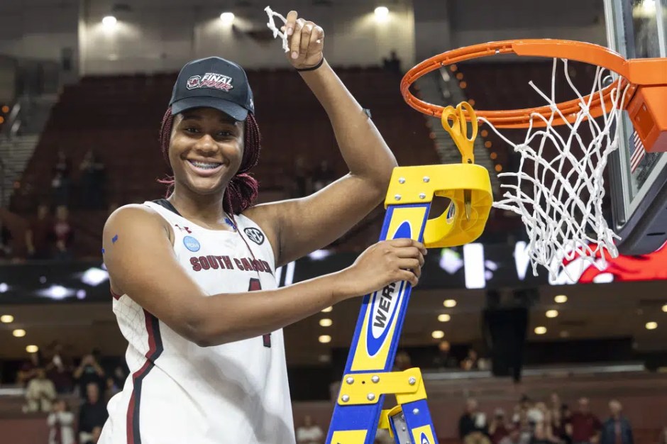 South Carolina’s Aliyah Boston (4) holds up her piece of the net defeating Maryland in an Elite 8 college basketball game of the NCAA Tournament in Greenville, S.C., Monday, March 27, 2023. (AP News photo)