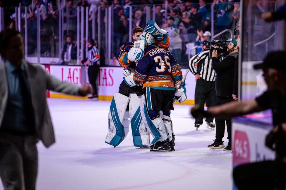 A day after clinching their spot in the Calder Cup playoffs, the San Jose Barracuda lost 4-0 to the Ontario Reign on Saturday. Martin Chromiak, Riley Walsh and Taylor Ward scored for the Reign. 18 year old Carter George made 33 saves for the win in his professional debut. Yaroslav Askarov made 24 saves in the loss. The loss makes home ice in the playoffs less likely for the Barracuda.
