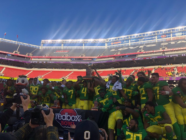 Oregon celebrates after winning the Redbox Bowl (Photo by Eric He)
