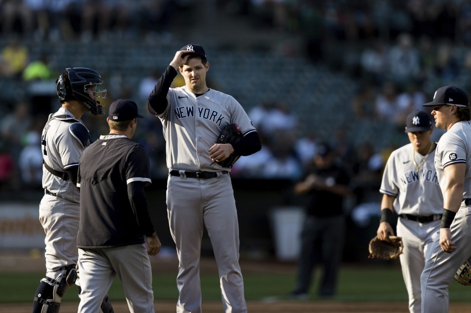 The A’s bullpen appeared equal to the task of backing up Blackburn, but were burned by consecutive errors in the seventh. Catcher Yan Gomes dropped a foul pop between third and home that extended Anthony Rizzo’s at-bat, and allowed him to deliver a ground ball that Chapman misplayed between his legs for an error that allowed Gary Sanchez to score from second and tie the game.