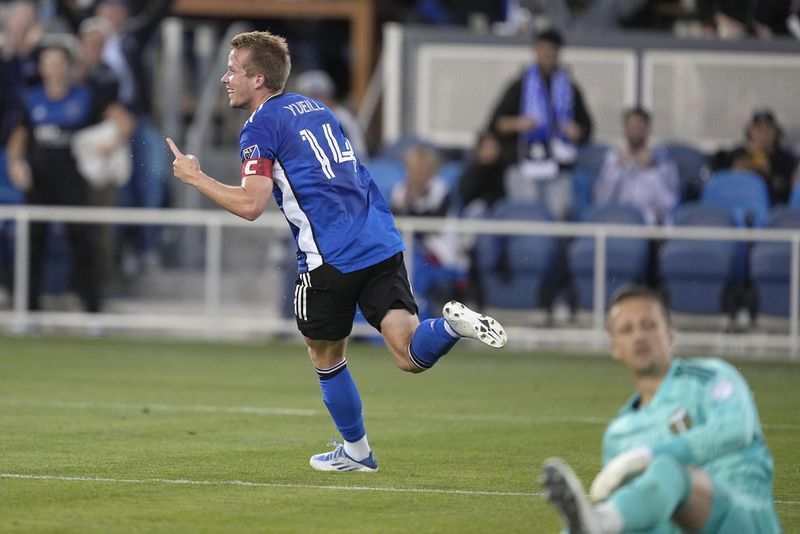 San Jose Earthquakes captain Jackson Yueill celebrates his second goal of the season after beating Portland Timbers goalie Aljaz Ivacic with a header in the first half at Pay Pal Park on Wed May 18, 2022 (Tony Avelar, Oregon Live)