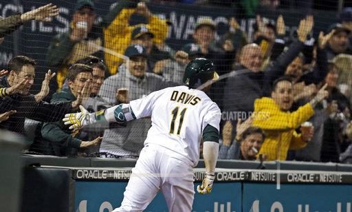 After Daniel Coulombe held the Twins scoreless in the top of the ninth, the A’s put Adam Rosales in the game to pinch-hit for Jaycob Brugman. Rosales drew a walk off Taylor Rogers. That brought Davis to bat who ended the game with his fourth home run of the year.