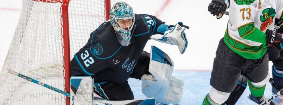 San Jose Barracuda goaltender Eetu Makiniemi (32) stopped 21 of 25 shots against the Rockford IceHogs at BMO Arena in Rockford IL on Sun Mar 17, 2024 (San Jose Barracuda photo)