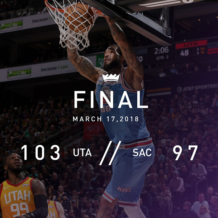 The Kings had to foul to stop the clock and keep the game close. They fouled Gobert who converted two free throws to make it six-point game. Garrett Temple hit a 3-pointer to bring the Kings back within three-points then they had to foul Ingles again. Ingles hit the first free throw but missed the second. Gobert grabbed the rebound slammed the ball home to give the Jazz a 103-97 lead which would be the final score.