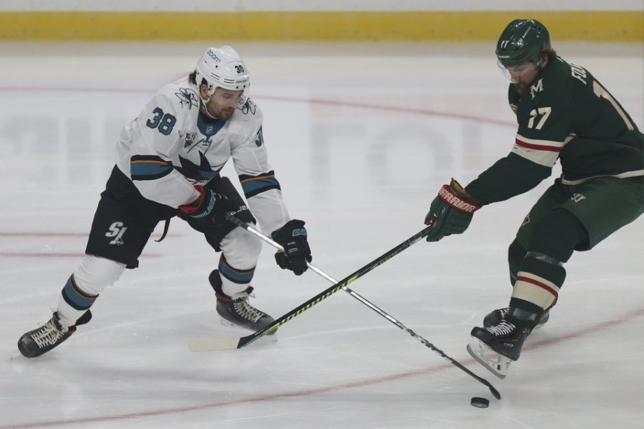 The San Jose Sharks Mario Ferraro (38) tries to get the stick on the puck against the Minnesota Wild’s Marcus Foligno (17) at Xcel Energy Center in St Paul on Sun Jan 24, 2021 (AP News photo)