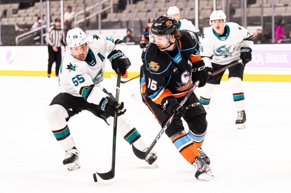 The San Jose Barracuda get swept in their home at home series with the San Diego Gulls this time concluding a two game series at the Pechanga Arena in San Diego on Fri Nov 26, 2021 (photo by San Jose Barracuda)