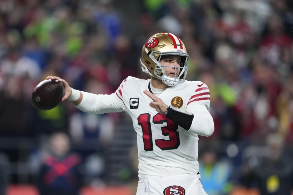 San Francisco 49ers quarterback Brock Purdy (13) looks for a receiver against the Green Bay Packers on Sun Jan 21, 2024 in the NFC Divisional game. Purdy and the 49ers prepare for the Detroit Lions for the NFC Championship game Sun Jan 28, 2024 (AP News photo)