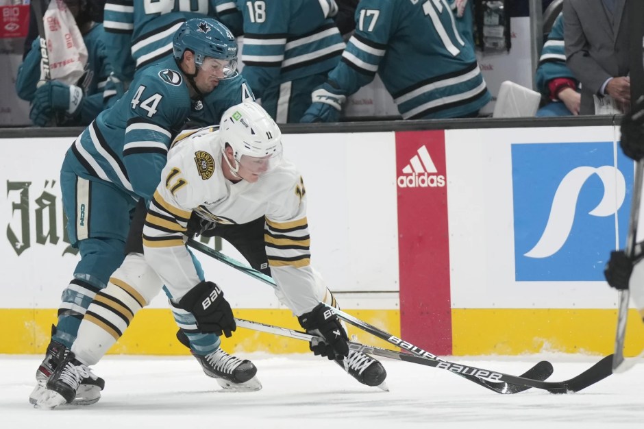 San Jose Sharks defenseman Marc Edouard-Vlasic (44) reaches his stick underneath the Boston Bruins center Trent Frederic (11) to get at a puck in the first period at SAP Center in San Jose on Thu Oct 19, 2023 (AP News photo)