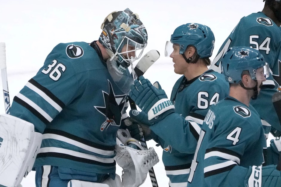San Jose Sharks Jake Walman (96) is congratulated by teammates Cody Ceci (4) and Nico Sturm (7) after scoring a third period goal against the St Louis Blues on Thu Dec 12, 2024 (AP News photo)