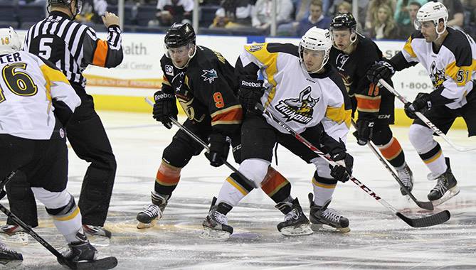 San Jose (29-14-2-4) drew first blood in the first period. With Stockton on a power play, Alex True picked up a loose puck in the neutral zone, skated in on a breakaway down the right win and fired a shot past Heat goalie Jon Gillies (10-14-4) for a short-handed goal and his team-leading 18th goal of the season at the 7:45 mark. It was the third short-handed goal of the season for the Cuda and the 15th given up by Stockton, the most in the AHL.