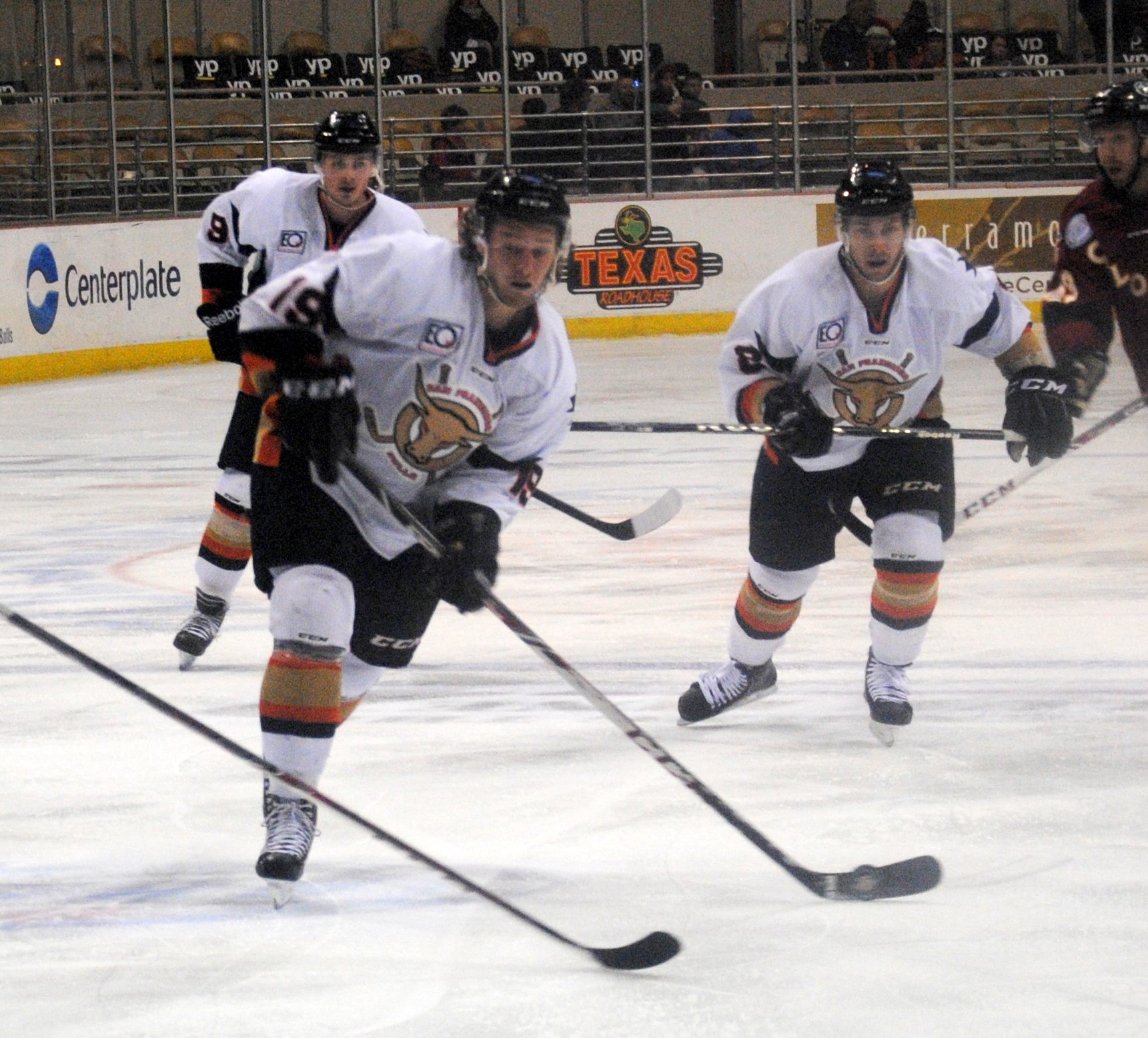 The Bulls also took the second penalty of the game, again to Foster, this time for high-sticking. At 14:03 of the first, Stockton scored on their eighth shot, a power play goal by Joey Martin from Corey Trevino and Matt Berglund.