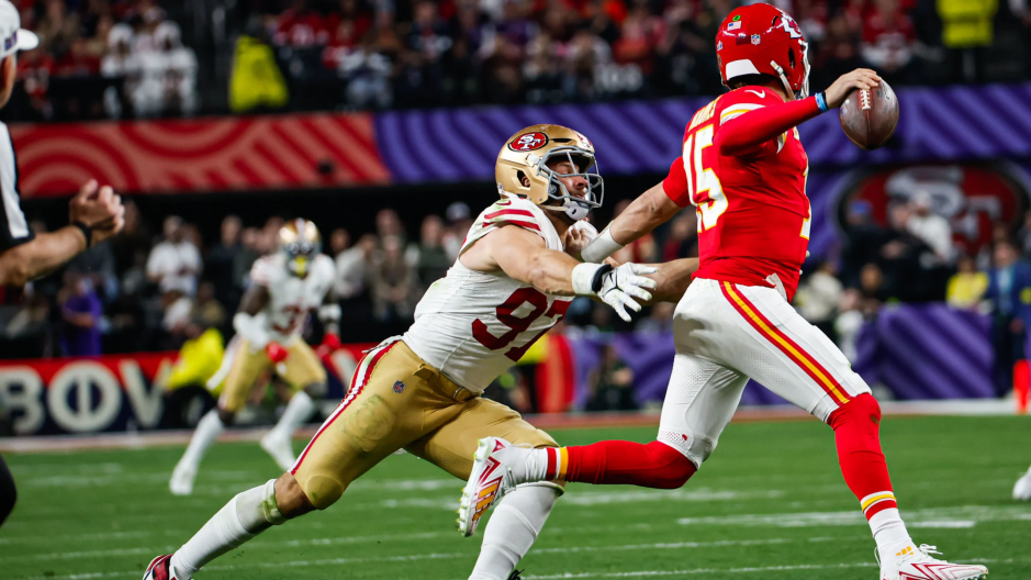 San Francisco 49ers defensive end Nick Bosa (#97) pursued Kansas City Chiefs quarterback Patrick Mahomes (#15) during Super Bowl LVIII at Allegiant Stadium in Las Vegas, Nevada on Sunday FEB 11, 2024. (Terrell Lloyd-San Francisco 49ers)