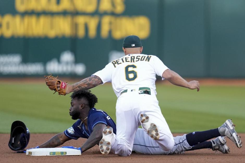 Tampa Bay Rays’ Randy Arozarena, rear, is tagged out at second by Oakland Athletics second baseman Jace Peterson on a steal attempt during the fourth inning at the Oakland Coliseum on Wed Jun 14, 2023 (AP News photo)