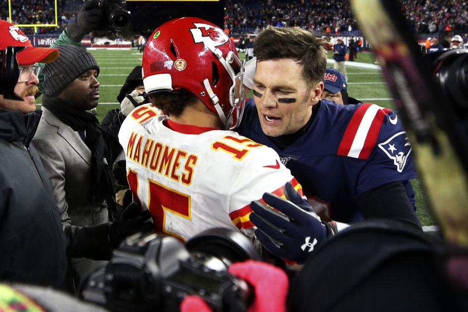 The Kansas City Chiefs quarterback Patrick Mahomes (15) meets with then New England Patriots quarterback Tom Brady (12) (arrowheadpride.com file photo)