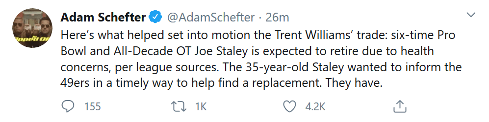 But according to an additional report by Schefter on Saturday that Staley is expected to retire do to health concerns, which allowed the trade for Williams to take shape:
