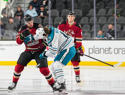 (Photo credit San Jose Barracuda) Montana Onyebuchi (79) throws down with Tucson Roadrunner Ryan McGregor (16) in the first period in Tucson.