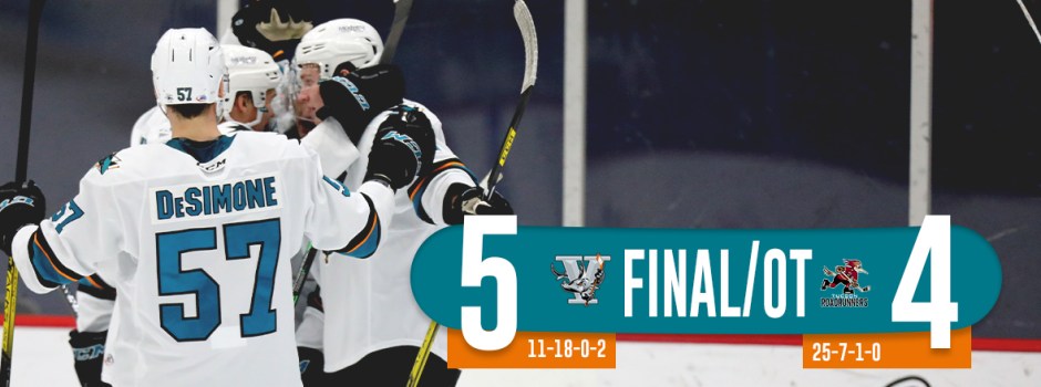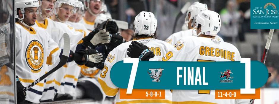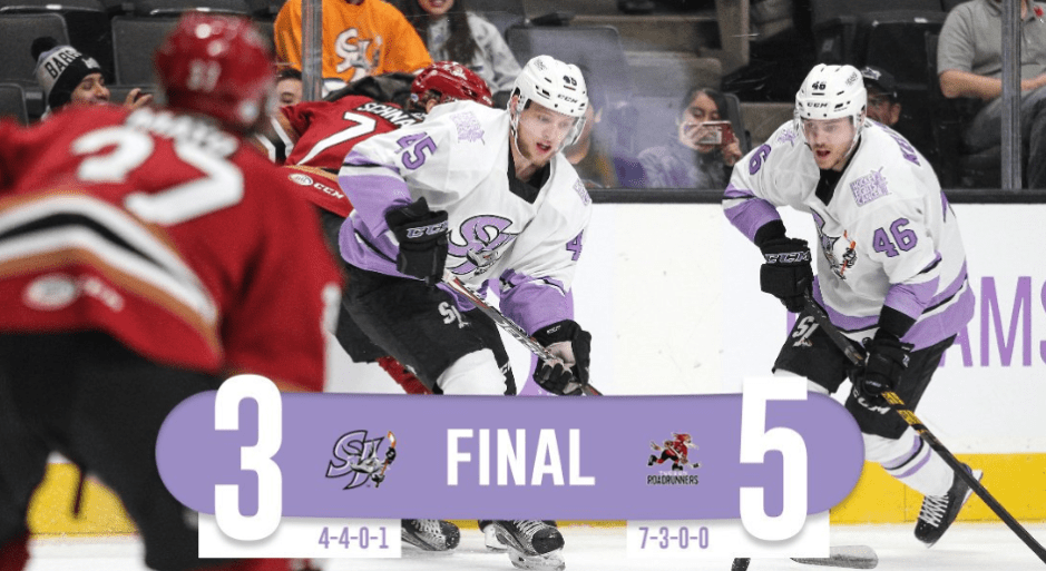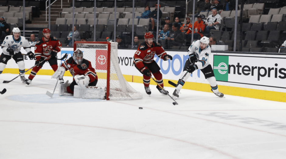 San Jose (16-25-3-2) drew first blood 27 seconds into the game. Jonny Brodzinski started a rush out of the ‘Cuda zone. Joachim Blichfled sent a pass from center ice that sprung Jeffery Viel on a breakaway. Viel made a deke to get Roadrunners goalie Ivan Prosvetov down before depositing a backhander into the back of the net for his ninth goal of the season goal. It was the quickest goal of the season for the Barracuda.
