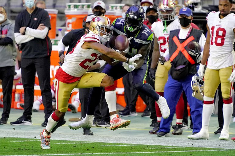 San Francisco 49ers cornerback Ahkello Witherspoon breaks up a pass intended for Seahawks wide receiver DK Metcalf (14) in the second half Sun Jan 3, 2021 (Rick Scuteri / The Associated Press)