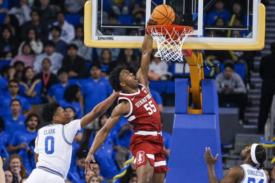Stanford forward Harrison Ingram dunks next to UCLA guard Jaylen Clark, left, during the second half of an NCAA college basketball game Thursday, Feb. 16, 2023, in Los Angeles. UCLA won 73-64. (AP News photo)