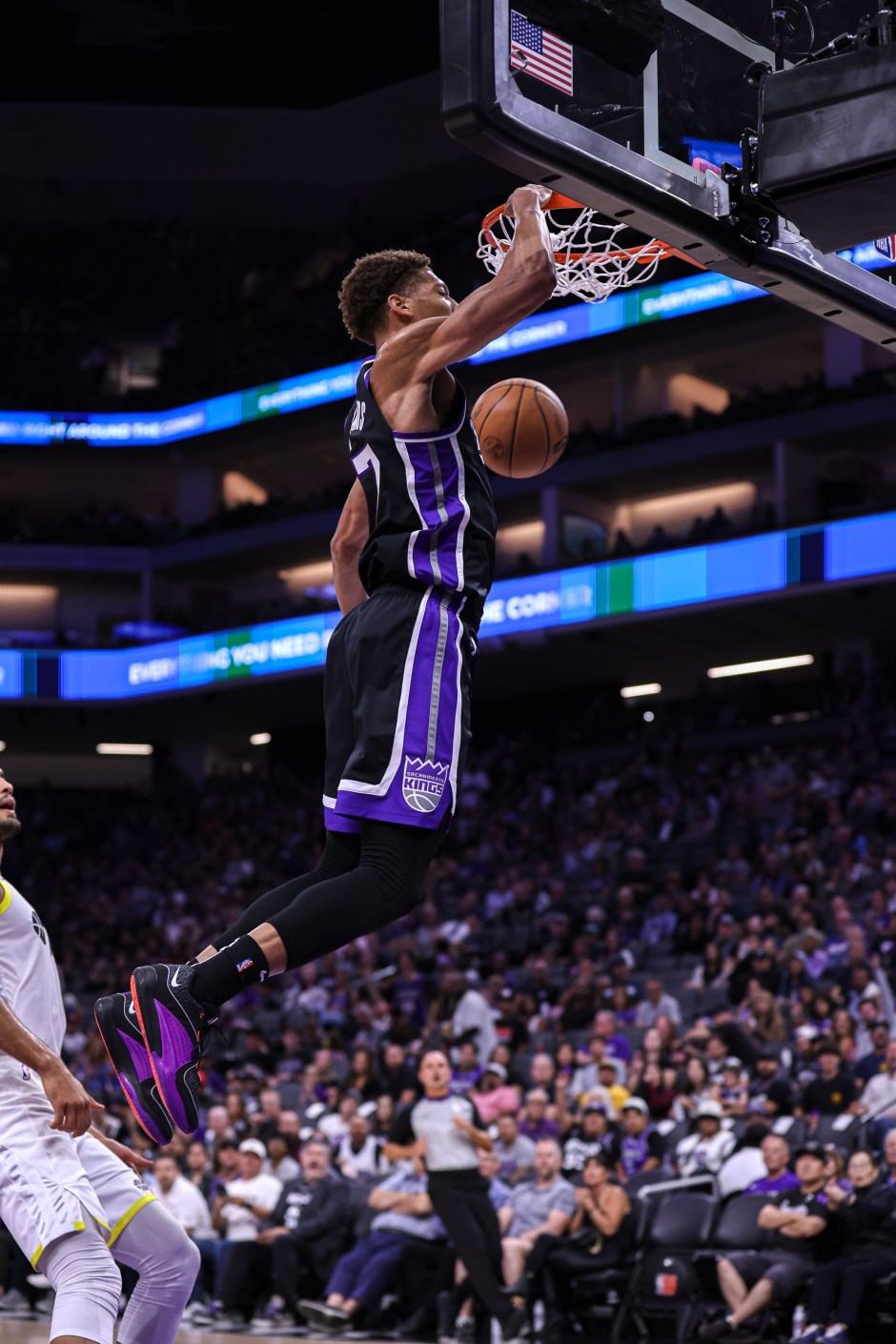 Sacramento Kings small forward Kessler Edwards (17) throws down against the Utah Jazz at Golden One Center in Sacramento on Thu Oct 19, 2023 (@SacramentoKings photo)