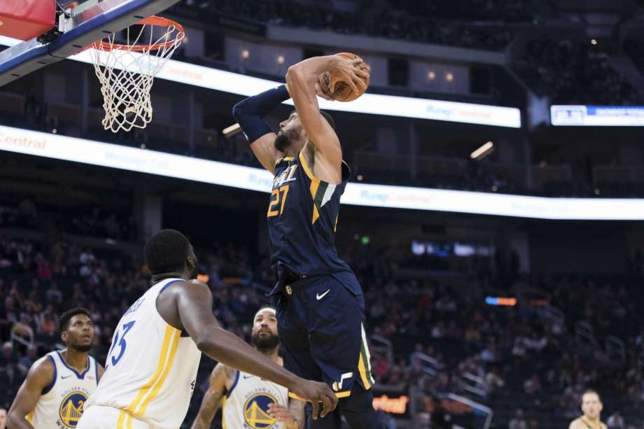 sfgate.com photo: The Utah Jazz Rudy Gobert takes a shot against the Golden State Warriors defense at Chase Center in San Francisco on Monday night
