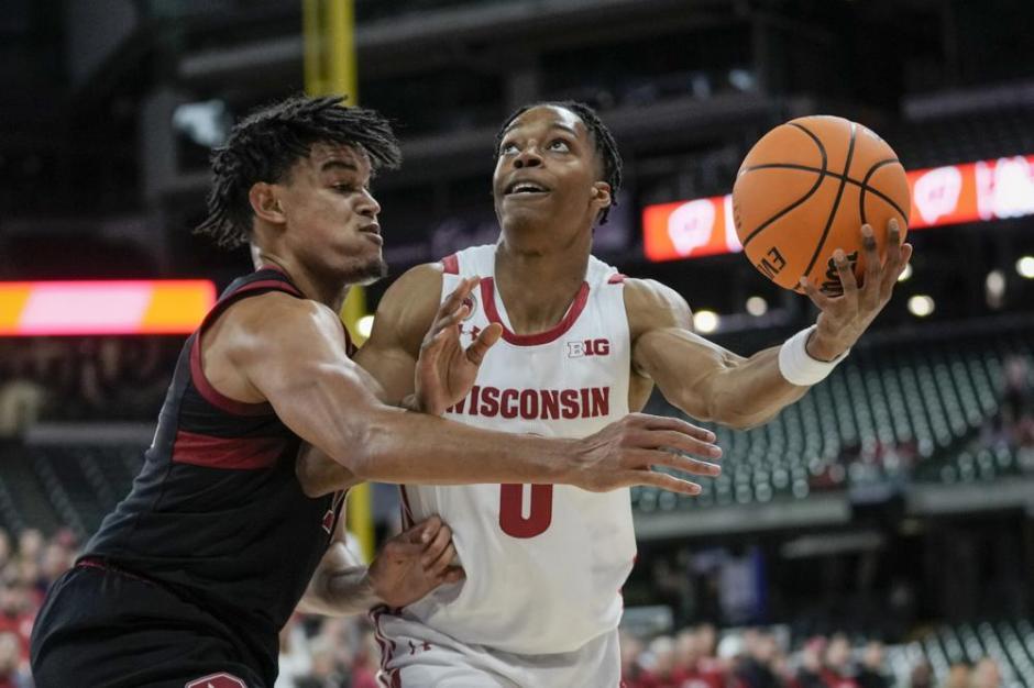 Wisconsin’s Jahcobi Neath shoots past Stanford’s Spencer Jones during first half action at American Family Park in Milwaukee Friday, Nov. 11, 2022 (AP News photo)